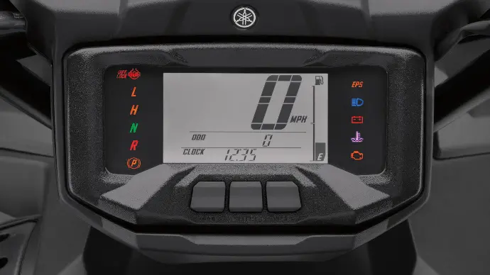 Kodiak 700 EPS SE'de yakıt göstergesi, hız göstergesi, kilometre sayacı, iki mesafe ölçer, saat ölçer, saat, 4 çeker durumu, vites seçici ve EPS uyarı lambası bulunan bir dijital gösterge ekranı vardır.