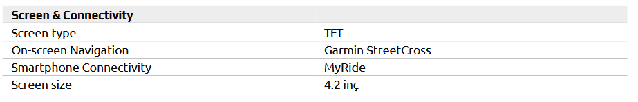 4,2 inç tam renkli, birden çok temaya sahip TFT gösterge paneli, Garmin navigasyon* dahil olmak üzere üst düzey işlevsellik sunar. Bağlantı Kartı Modülü ile donatılmış bağlantılı cihazlar müzik dinleme**, gelen aramaları cevaplama**, e-posta ve SMS bildirimlerini görüntüleme gibi birçok işlev sunar. Yamaha'nın MyRide uygulamasını indirin ve arkadaşlarınız, aileniz ve iş arkadaşlarınızla iletişimde kalın. (*Tam harita destekli Garmin Navigasyon, NMAX Tech MAX modelleri için ücretsizdir ancak tüm ülkelerde sunulmaz. Navigasyon özelliklerinin bazıları tüm ülkelerde kullanılamayabilir. **Ses hizmetleri için Bluetooth iletişimi özellikli ayrı bir kulaklık gerekir.)