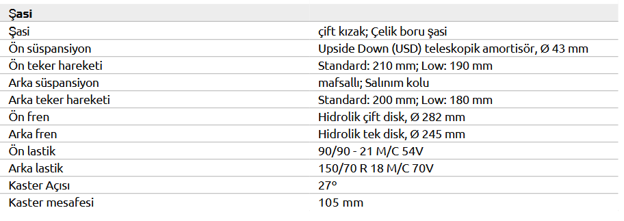 Ténéré 700, doğrudan fabrika çıkışı olarak daha erişilebilir bir alçak sele versiyonuyla da sunulur. Önde ve arkada 20 mm daha amortisör çalışma aralığının yanı sıra kısaltılmış bir yan sehpa ile sunulan bu versiyon 860 mm sele yüksekliğine sahiptir ve hakim oturma pozisyonunu koruyarak daha alçak bir sele yüksekliğini tercih edenlere Ténéré deneyimini yaşama olanağı sunar. Bu versiyon, sıkıştırma ve sönümleme ayarına sahip ön amortisör çatalları (ön yük ayarı dahil değildir) ve 2024 Ténéré 700 Explore'dan türetilen tamamen ayarlanabilir arka amortisör ve bağlantı yapısı sayesinde sürücüler için büyük önem taşıyan güvenilir performansı sunar.