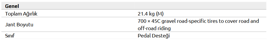 A Ekranı arabirimindeki hız ölçer, akü kapasitesi göstergesi, destek modu ayarı, günlük kilometre sayacı, kilometre sayacı ve menzili gösteren basit geniş formatlı LCD ekranla bilgiler kolayca okunabilir ve daha fazla konfor için destek modu tek bir düğmeyle değiştirilebilir.