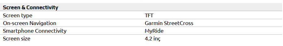 Gündüz ya da gece, şehir içi yolculukların veya hafta sonu gezilerinin keyfini çıkarırken şık Tech MAX+ gösterge paneli ihtiyaç duyacağınız bütün bilgileri sağlar. Sağ tarafta 4,2 inç tam renkli TFT ekranı ve sol tarafta 2,8 inç LCD okuma ekranı ile yenilenen bir tasarıma sahip olan en yeni gösterge, çeşitli bağlantı işlevleri hakkında çeşitli çalışma verileri ve bilgiler sunar.