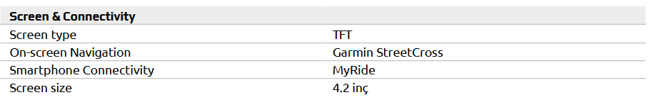 Kolay okunan 4,2 inç tam renkli TFT bilgi-eğlence ekranı, akıllı telefon üzerinden ücretsiz Garmin navigasyonu* destekler. Siz sadece varış yerini belirleyin. Sezgisel sistem, gerçek zamanlı trafik bilgilerine, kalan mesafeye, tahmini varış süresine ve daha birçok özelliğe erişim sağlayarak her yolculuğu daha kolay ve daha keyifli hale getirir. (*Navigasyon uygulaması bazı ülkelerde kullanıma sunulmamaktadır. Bazı ülke ve bölgelerde hız sınırları, trafik vb. hakkında bilgi verilmemektedir. Hız sınırı verileri zamanında güncellenemeyebilir ve okul alanları ya da şantiyeler gibi konumlarda hız sınırları günün saatine bağlı olarak değişebilir.)